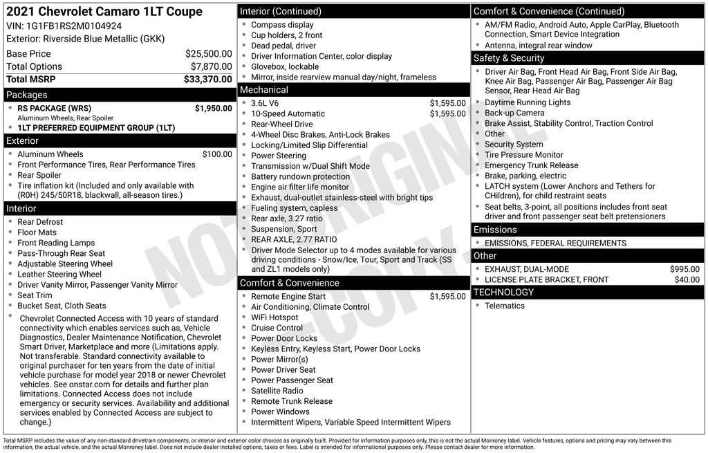 color, Cloth Seat Trim, Compass, Dark Tint LED Tail Lamps, Decklid-Mounted Lip Spoiler, Delay-off headlights, Driver door bin, Driver vanity mirror, Dual front impact airbags, Dual front side impact airbags, Dual Mode Exhaust, Electronic Stability Control, Exterior Parking Camera Rear, Four wheel independent suspension, Front anti-roll bar, Front Bucket Seats, Front Center Armrest, Front License Plate Bracket, Front reading lights, Front Sport Bucket Seats, Fully automatic headlights, Illuminated entry, Knee airbag, Leather Shift Knob, Low tire pressure warning, Occupant sensing airbag, Overhead airbag, Paddle-Shift Manual Controls, Panic alarm, Passenger door bin, Passenger vanity mirror, Power door mirrors, Power driver seat, Power passenger seat, Power steering, Power windows, Preferred Equipment Group 1LT, Premium audio system: Chevrolet Infotainment System, Radio data system, Radio: Chevrolet Infotainment 3 System, Rear anti-roll bar, Rear window defroster, Remote keyless entry, Remote Vehicle Starter System, RS Package, Security system, SiriusXM Radio, Speed control, Speed-sensing steering, Steering wheel mounted audio controls, Tachometer, Telescoping steering wheel, Tilt steering wheel, Tire Inflation Kit, Traction control, Trip computer, Variably intermittent wipers, Voltmeter, Wheels: 20" 5-Split Spoke Aluminum, Wheels: 20" 5-Split Spoke Machined-Face Aluminum, **BACKUP CAMERA**, **REMOTE START**, Apple CarPlay/Android Auto.