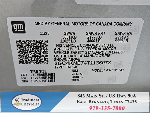 Package, Z71 Off-Road & Protection Package (1st & 2nd Row All-Weather Floor Liners (LPO) (AAK) and Wheels: 18" Machined Alum w/Silver Painted Accents), 10-Speed Automatic, 4WD, H0y Jet Black Cloth, 120-Volt Bed Mounted Power Outlet, 120-Volt Interior Power Outlet, 17" Machined Aluminum Wheels, 170 Amp Alternator, 2-Speed Electronic Shift Transfer Case, 3.73 Rear Axle Ratio, 4-Way Manual Driver Seat Adjuster, 4-Wheel Disc Brakes, 6 Speakers, 6-Speaker Audio System, 6" Rectangular Chromed Tubular Assist Steps (LPO), 720 Cold-Cranking Amps Heavy-Duty Battery, ABS brakes, Air Conditioning, Alloy wheels, AM/FM radio: SiriusXM with 360L, Apple CarPlay/Android Auto, Auto High-beam Headlights, Auto-Dimming Inside Rear-View Mirror, Black Mirror Caps, Bluetooth® For Phone, Brake assist, Bumpers: chrome, Chevrolet Connected Access Capable, Cloth Seat Trim, Color-Keyed Carpeting Floor Covering, Compass, Deep-Tinted Glass, Delay-off headlights, Driver door bin, Driver vanity mirror, Dual front impact airbags, Dual front side impact airbags, Durabed Pickup Bed, Electronic Cruise Control w/Set & Resume Speed, Electronic Stability Control, Emergency communication system: OnStar, EZ Lift Power Lock & Release Tailgate, Front 40/20/40 Split-Bench Seats w/Lockable Storage, Front anti-roll bar, Front Center Armrest w/Storage, Front reading lights, Front Rubberized Vinyl Floor Mats, Front wheel independent suspension, Fully automatic headlights, Halogen Reflector Headlamps, HD Rear Vision Camera, Heated & Auto-Dimming Vertical Trailering Mirrors, Heated door mirrors, Heated Vertical Trailering Mirrors, Illuminated entry, Keyless Open & Start, LED Smoked Amber Roof Marker Lamps, Low tire pressure warning, Occupant sensing airbag, OnStar Services Capable, Outside temperature display, Overhead airbag, Overhead console, Panic alarm, Passenger door bin, Passenger vanity mirror, Power Door Locks, Power door mirrors, Power Front Windows w/Driver Express Up/Down, Power Front Windows w/Passenger Express Down, Power Rear Windows w/Express Down, Power steering, Power windows, Premium audio system: Chevrolet Infotainment 3 Premium, Push Button Start, Pwr Up/Down Tailgate Function w/Pwr Lock & Release, Radio: Chevrolet Infotainment 3 Premium System, Rear 60/40 Folding Bench Seat (Folds Up), Rear reading lights, Rear Rubberized Vinyl Floor Mats, Rear step bumper, Remote keyless entry, SiriusXM w/360L Trial Subscription, Speed control, Split folding rear seat, Standard Tailgate, Steering Wheel Audio Controls, Steering wheel mounted audio controls, Tachometer, Tilt steering wheel, Traction control, Trip computer, Turn signal indicator mirrors, Variably intermittent wipers, Voltmeter, Wheels: 20" 10-Spoke Machined Aluminum, Wi-Fi Hotspot Capable, Wireless Phone Projection, and Wrapped Steering Wheel. Tax, title, license and dealer fees (unless itemized above) are extra. Not available with special finance or lease offers. See Dealer for Details. Price includes: $1000 - Customer Cash. Exp. 01/02/2026
