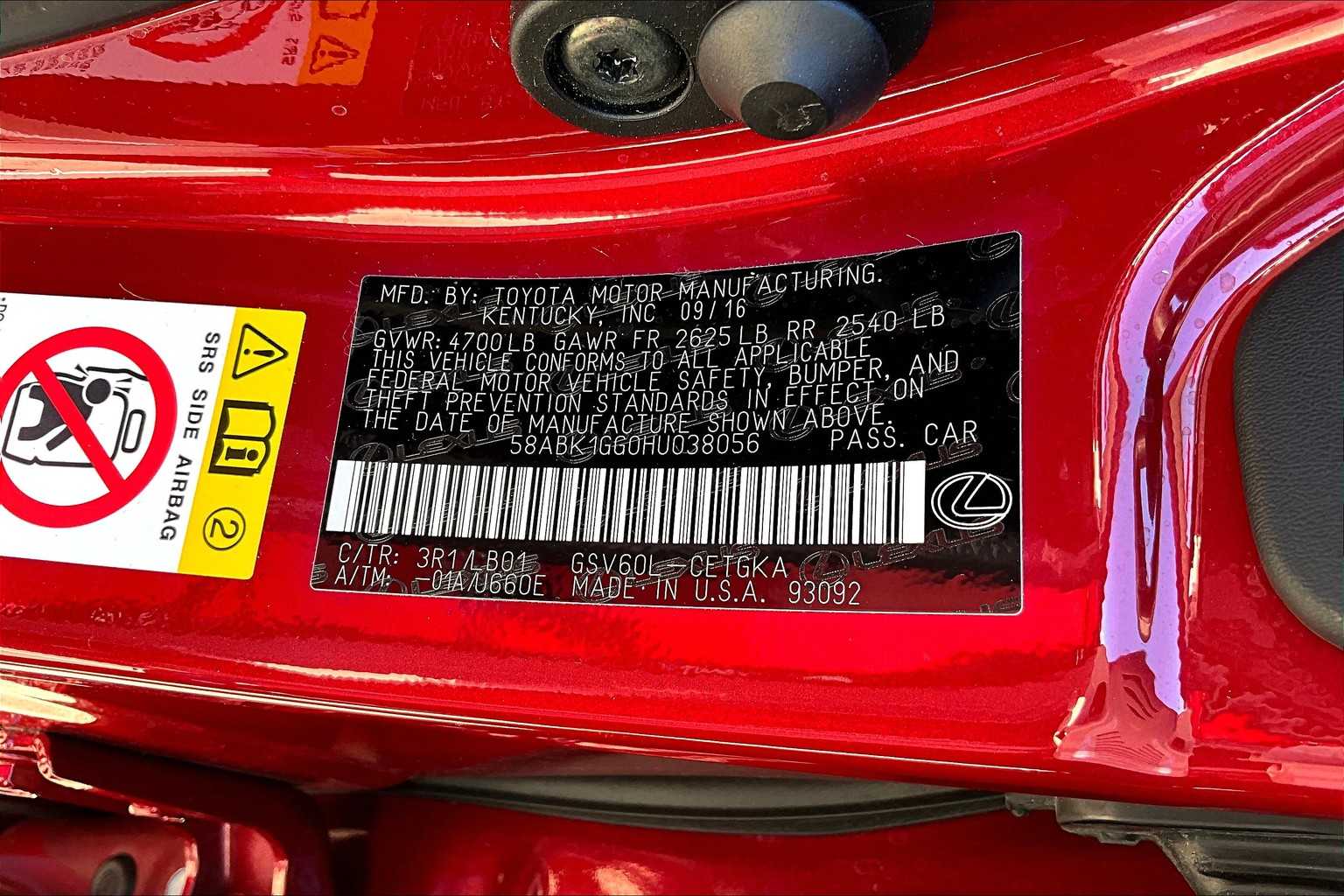• BLIND SPOT MONITOR W/REAR CROSS TRAFFIC ALERT -inc: lane change assist ,BI-LED HEADLAMPS -inc: LED DRLs, foglamps, and automatic high beams ,LUXURY PACKAGE -inc: Synthetic Leather Shift Lever, Heated External Mirrors w/Memory, Genuine Wood Trim, wood trim on center console and cup holder, Memory Driver Seat, Power Tilt & Telescopic Steering Wheel w/Memory, Heated & Ventilated Front Seats ,NAVIGATION SYSTEM PACKAGE -inc: EMVN, advanced voice command casual-language voice recognition system, Bluetooth hands free phone and automatic phonebook download capabilities, Bluetooth streaming audio, HD Radio w/iTunes tagging (complimentary traffic and weather), remote touch interface navigation controller w/side enter buttons and back button, MP3/WMA, dual USB/iPod audio input plugs and Lexus Insider, Lexus Enform App Suite, destination search, Yelp, iHeartRadio, Facebook Places, Movietickets.com, OpenTable, Pandora, Slacker, stocks, fuel prices and sports, Lexus Enform Destinations, Destination Assist and eDestination (1-year trial subscription included) ,FRONT & REAR INTUITIVE PARKING ASSIST -inc: clearance and back sonar ,3 SPOKE LEATHER & WOOD HEATED STEERING WHEEL ,ACCESSORY PACKAGE 2 -inc: Carpet Trunk Mat, Rear Bumper Applique, Key Gloves, Alloy Wheel Locks, Cargo Net (PPO)