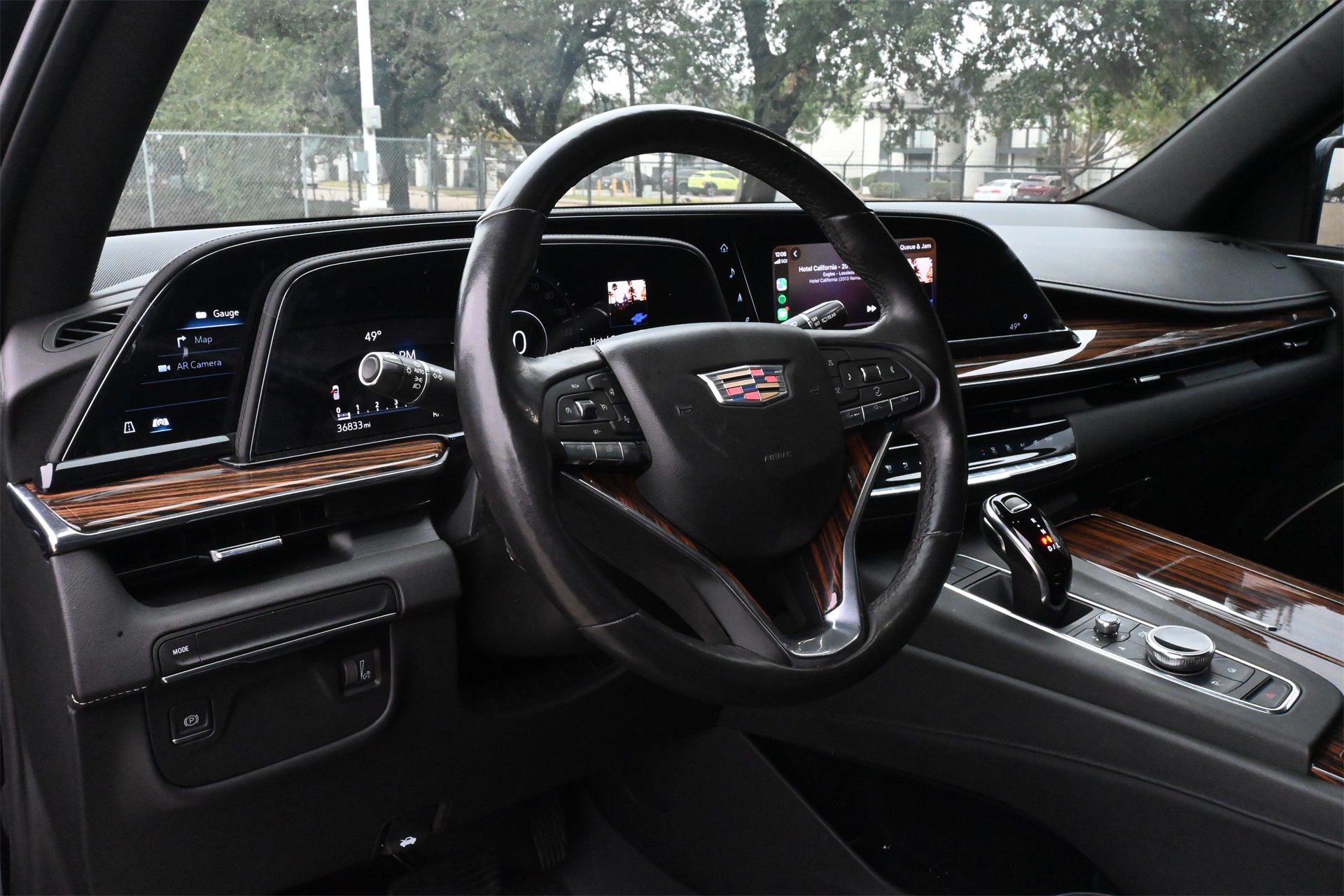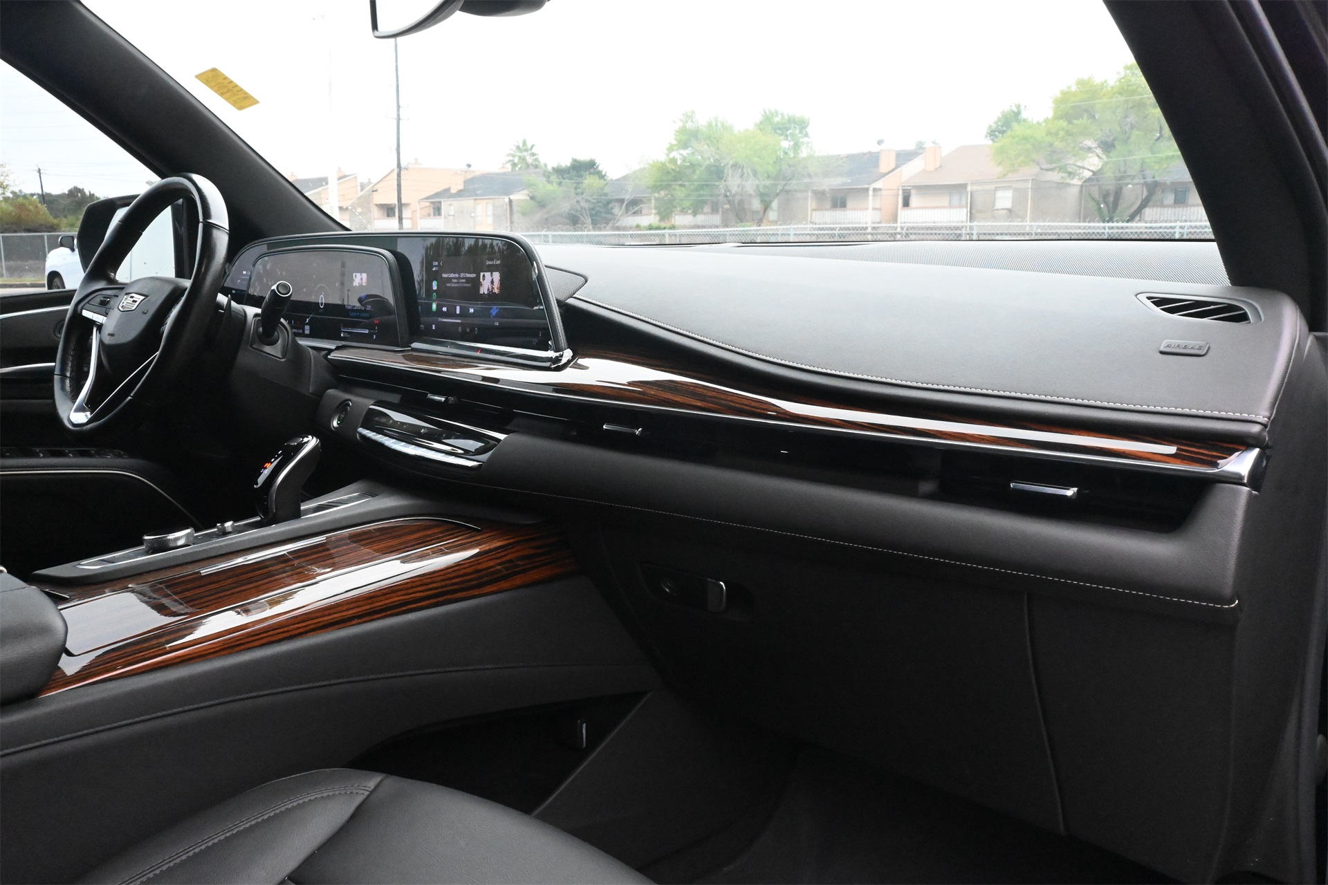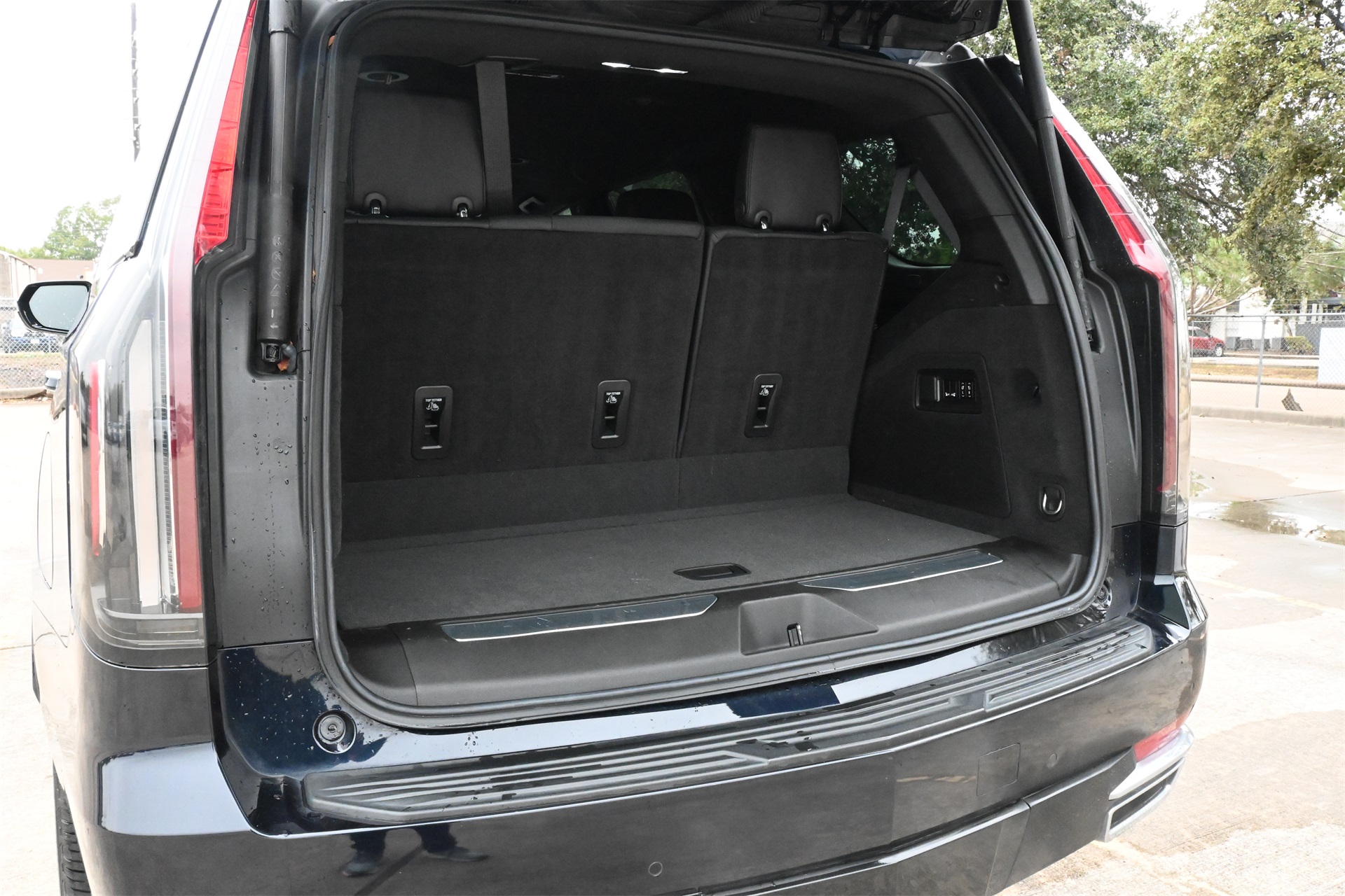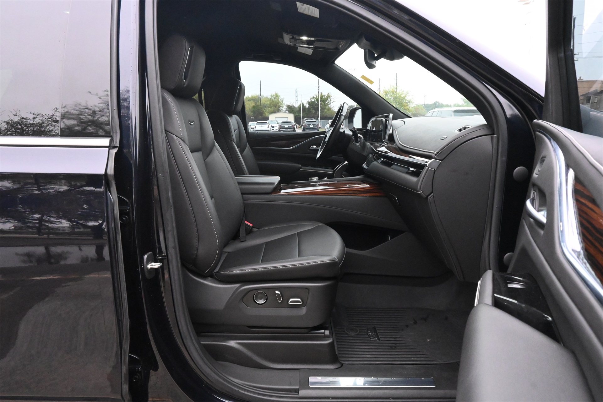 AKG Studio 19-Speaker Audio System, Alloy wheels, AM/FM radio: SiriusXM with 360L, Apple CarPlay/Android Auto, Audio memory, Auto High-beam Headlights, Auto tilt-away steering wheel, Auto-dimming door mirrors, Auto-dimming Rear-View mirror, Automatic temperature control, Brake assist, Bumpers: body-color, Compass, Delay-off headlights, Driver door bin, Driver vanity mirror, Dual front impact airbags, Dual front side impact airbags, Electronic Stability Control, Emergency communication system: OnStar and Cadillac connected services capable, Four wheel independent suspension, Front anti-roll bar, Front Bucket Seats, Front Center Armrest w/Storage, Front dual zone A/C, Front License Plate Bracket, Front reading lights, Fully automatic headlights, Garage door transmitter, HD Radio, Heated door mirrors, Heated Driver & Front Passenger Seats, Heated front seats, Heated rear seats, Heated steering wheel, Illuminated entry, Leather steering wheel, Leatherette Seats, Low tire pressure warning, Memory seat, Navigation System, Not Equipped w/Automatic Stop/Start, Occupant sensing airbag, Outside temperature display, Overhead airbag, Overhead console, Panic alarm, Passenger door bin, Passenger vanity mirror, Power door mirrors, Power driver seat, Power Liftgate, Power passenger seat, Power steering, Power windows, Premium Smooth Ride Suspension, Radio data system, Radio: AM/FM/SiriusXM w/Navigation, Rain sensing wipers, Rear air conditioning, Rear anti-roll bar, Rear reading lights, Rear window defroster, Rear window wiper, Remote keyless entry, Roof rack: rails only, SiriusXM w/360L, Speed control, Split folding rear seat, Spoiler, Steering wheel memory, Steering wheel mounted audio controls, Tachometer, Teen Driver, Telescoping steering wheel, Tilt steering wheel, Traction control, Trip computer, Turn signal indicator mirrors, Variably intermittent wipers, Voltmeter, Wheels: 22" 14-Spoke Alloy w/Bright Silver Finish, and Wireless Apple CarPlay/Wireless Android Auto. Dark Moon Blue Metallic RWD 10-Speed Automatic with Overdrive 6.2L V8 CARFAX 1-Owner, Clean CARFAX!, Non-Smoker, Local Trade, Low Miles, Bluetooth, Apple Carplay / Android Auto, Jet Black Artificial Leather.