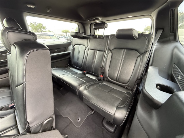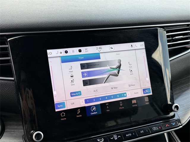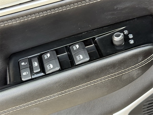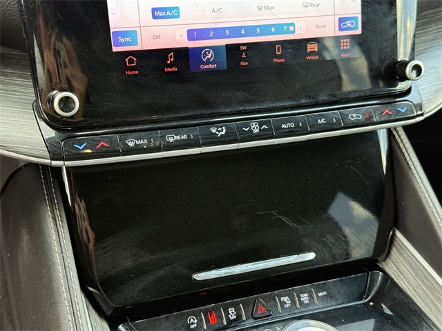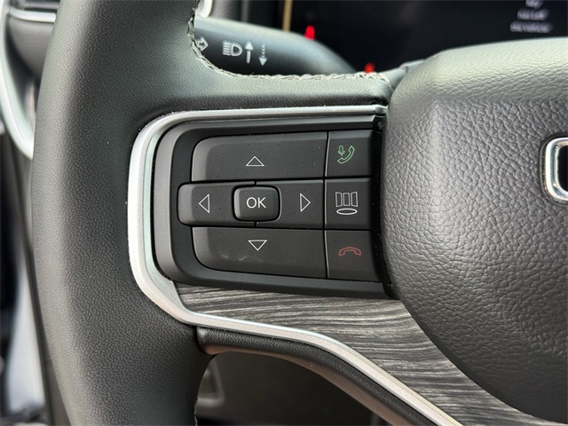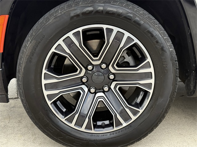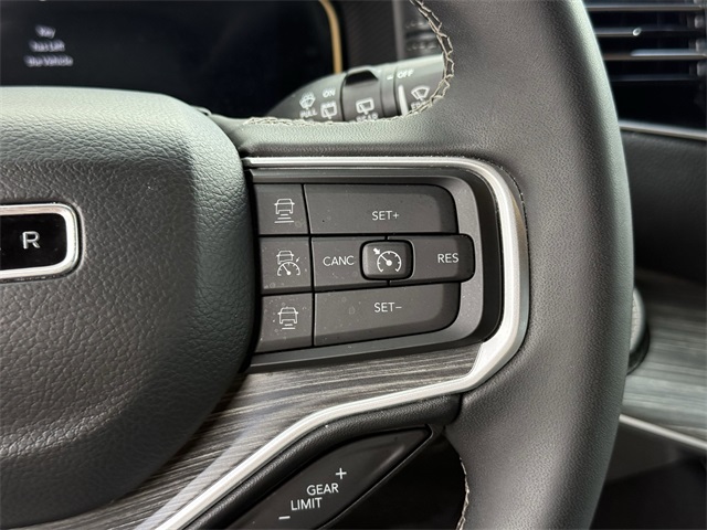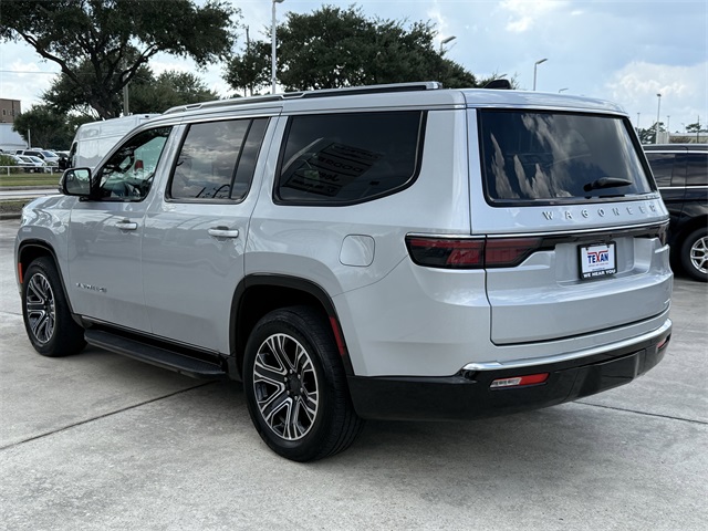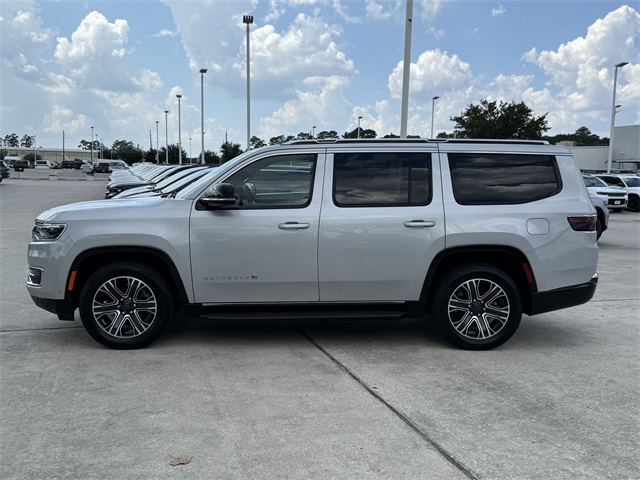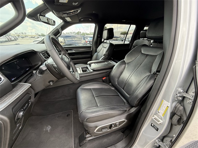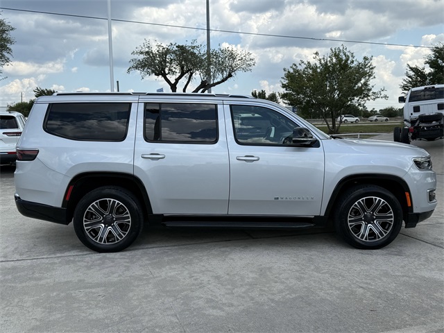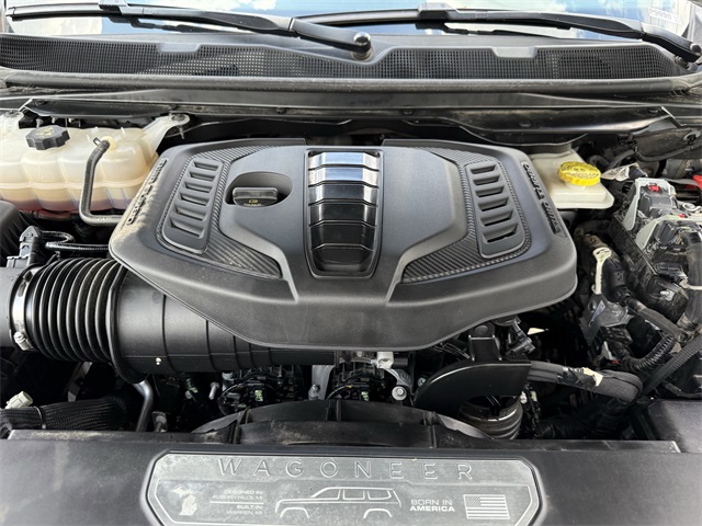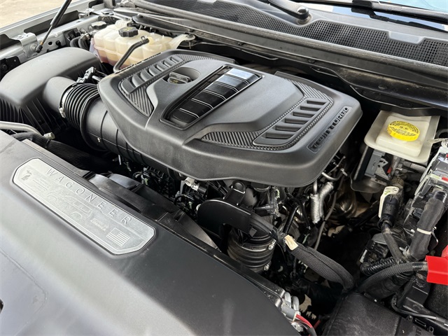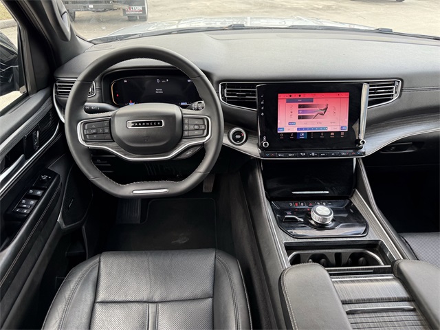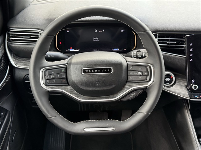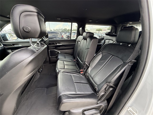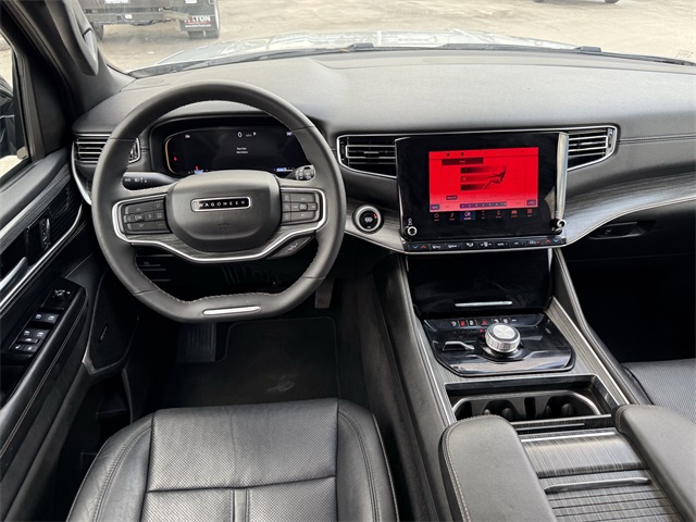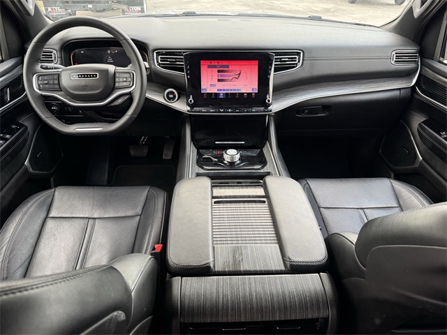 e assist, Bumpers: body-color, Delay-off headlights, Driver vanity mirror, Driver's Seat Mounted Armrest, Dual front impact airbags, Dual front side impact airbags, Electronic Stability Control, Emergency communication system: Wagoneer Connect, Exterior Parking Camera Rear, Four wheel independent suspension, Front anti-roll bar, Front Bucket Seats, Front Center Armrest w/Storage, Front dual zone A/C, Front fog lights, Front reading lights, Fully automatic headlights, Garage door transmitter, Genuine wood console insert, Genuine wood dashboard insert, Genuine wood door panel insert, Heated door mirrors, Heated front seats, Heated rear seats, Heated steering wheel, Illuminated entry, Knee airbag, Leather Trimmed Bucket Seats, Low tire pressure warning, Memory seat, Navigation System, Normal Duty Suspension, Occupant sensing airbag, Outside temperature display, Overhead airbag, Panic alarm, Passenger door bin, Passenger seat mounted armrest, Pedal memory, Power adjustable front head restraints, Power door mirrors, Power driver seat, Power Liftgate, Power passenger seat, Quick Order Package 25J, Radio: Uconnect 5 Nav w/10.1" Display, Rain sensing wipers, Rear anti-roll bar, Rear dual zone A/C, Reclining 3rd row seat, Remote keyless entry, Security system, Speed control, Speed-sensing steering, Speed-Sensitive Wipers, Split folding rear seat, Steering wheel memory, Steering wheel mounted audio controls, Telescoping steering wheel, Tilt steering wheel, Traction control, Turn signal indicator mirrors, Variably intermittent wipers, Ventilated front seats, Wheels: 20" x 9.0" Premium 2 Aluminum. CARFAX One-Owner.