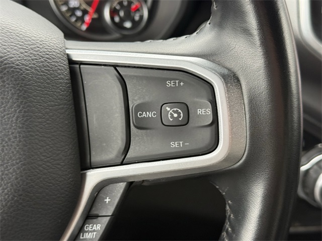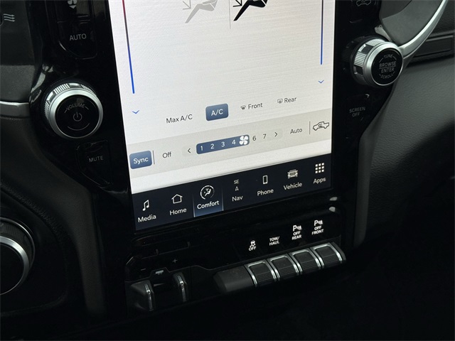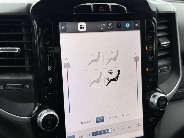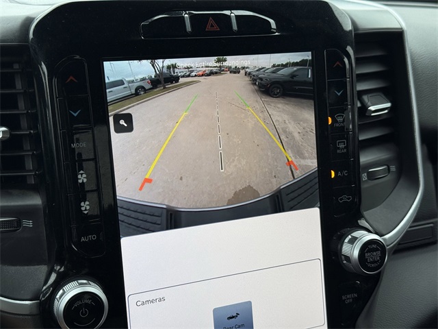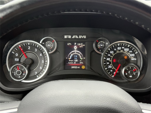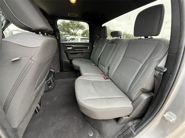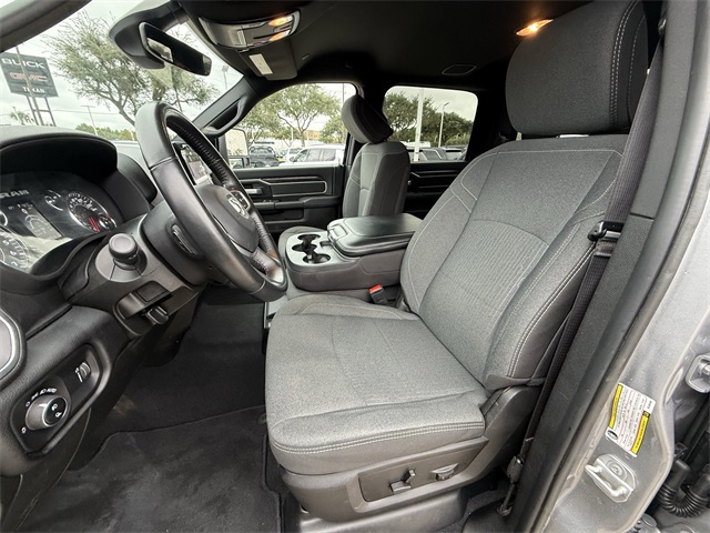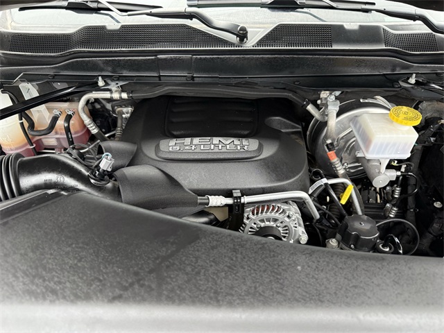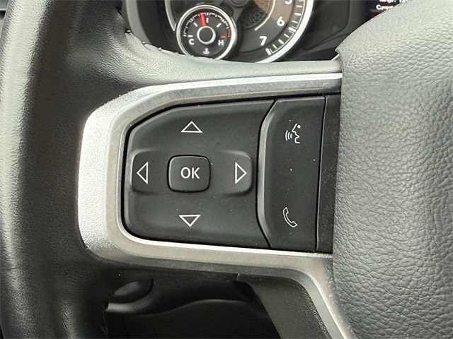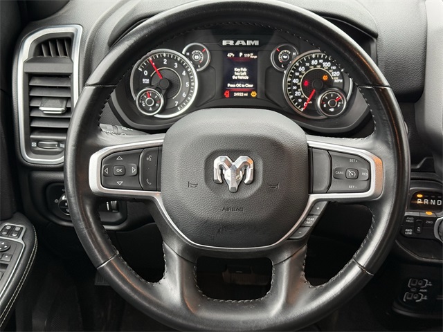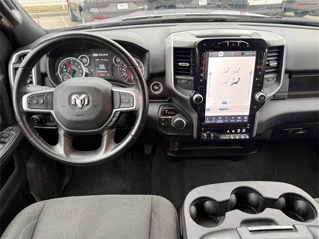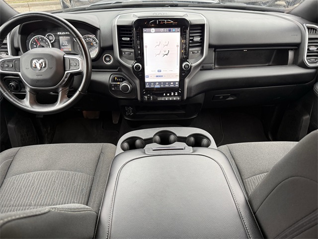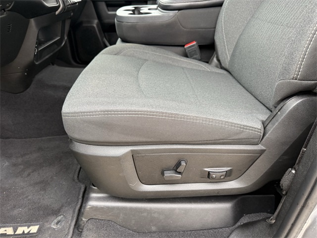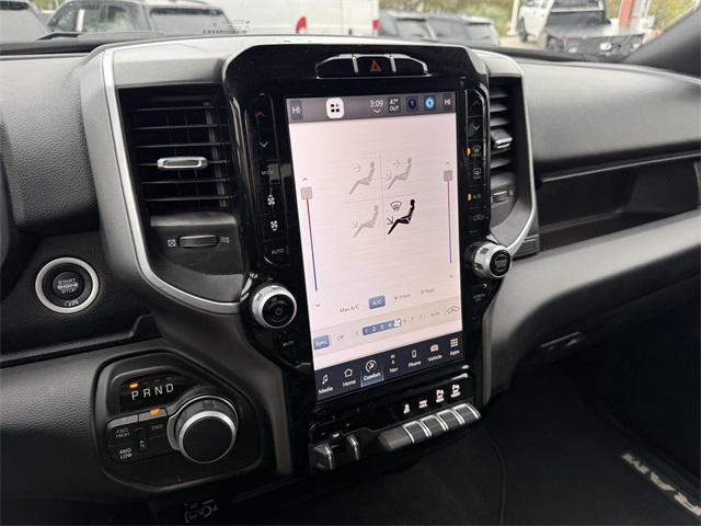 lity Group, Big Horn IP Badge, Black Exterior Mirrors, Black Exterior Truck Badging, Black Headlamp Bezels, Black Interior Accents, Black Ram Head Tailgate Badge, Black Tail Lamp Bezels, Black Wheel Center Hub, Bluetooth Handsfree Phone & Audio, Body Color Door Handles, Body Color Grille Surround, Brake assist, Bumpers: chrome, Center Hub, Center Stack Storage Drawer, Cloth 40/20/40 Bench Seat, Connectivity - US/Canada, Delay-off headlights, Dual front impact airbags, Dual front side impact airbags, Dual Glove Boxes, Electronic Stability Control, Electronically Controlled Throttle, Emergency communication system: SiriusXM Guardian, Exterior Mirrors Courtesy Lamps, Exterior Mirrors w/Heating Element, Exterior Mirrors w/Supplemental Signals, Foam Bottle Insert (Door Trim Panel), Footwell Courtesy Lamp, For Details, Visit DriveUconnect.com, For More Info, Call 800-643-2112, Forward & Reverse Utility Lights, Front anti-roll bar, Front Armrest w/Cupholders, Front Center Armrest w/Storage, Front Center Seat Cushion Storage, Front Fog Lamps, Front reading lights, Front Seat Back Map Pockets, Fully automatic headlights, Global Telematics Box Module (TBM), Gloss Black Nostrils/MIC Black Grille, Glove Box Lamp, Google Android Auto, GPS Antenna Input, GPS Navigation, Illuminated entry, Integrated Center Stack Radio, Integrated Voice Command w/Bluetooth, Leather Wrapped Steering Wheel, LED Bed Lighting, Level 1 Equipment Group, Locking Lower Glove Box, Low tire pressure warning, Manual Adjust 4-Way Driver Seat, Manual Adjust 4-Way Front Passenger Seat, Mirror Running Lights, MOPAR Deployable Bed Step, MOPAR Spray In Bedliner, Night Edition, Occupant sensing airbag, Outside temperature display, Overhead airbag, Painted Flat Cab-Length Side Steps, Painted Front Bumper, Painted Rear Bumper, Panic alarm, ParkSense Front/Rear Park Assist System, ParkView Rear Back-Up Camera, Power 2-Way Driver Lumbar Adjust, Power Adjust 8-Way Driver Seat, Power Adjust Mirrors, Power Adjustable Convex Aux Mirrors, Power door mirrors, Power Heated Fold Telescope Mirrors, Power Telescoping Mirrors, Premium Cloth 40/20/40 Bench Seat, Premium Cloth 40/20/40 Bench Seat (DISC), Protection Group, Quick Order Package 2GZ Big Horn, Radio: Uconnect 5 W w/8.4" Display (A62), Rear 60/40 Folding Seat, Rear anti-roll bar, Rear Dome w/On/Off Switch Lamp, Rear Folding Seat, Rear seat center armrest, Rear step bumper, Remote keyless entry, Remote USB Port - Charge Only, Selectable Tire Fill Alert, SiriusXM Radio Service, SiriusXM Satellite Radio, Speed control, Steering Wheel Mounted Audio Controls, Storage Tray, Tilt steering wheel, Tip Start, Tow Hooks, Traction control, Trailer Tow Pages, Trip computer, Turn signal indicator mirrors, Variably intermittent wipers, Voltmeter, Wheels: 18" x 8.0" Polished Aluminum, Wheels: 20" x 8.0" Black Painted Aluminum. CARFAX One-Owner.