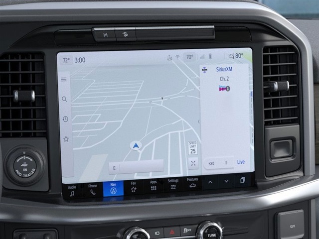 m Headlights, Auto-dimming door mirrors, Auto-dimming Rear-View mirror, Automatic temperature control, BlueCruise Equipped (1-Year Plan), Brake assist, Bumpers: chrome, Chrome wheels, Compass, Delay-off headlights, Driver door bin, Driver vanity mirror, Dual front impact airbags, Dual front side impact airbags, Electronic Stability Control, Emergency communication system: SYNC 4 911 Assist, Front anti-roll bar, Front Bucket Seats, Front Center Armrest, Front dual zone A/C, Front fog lights, Front License Plate Bracket, Front reading lights, Front wheel independent suspension, Fully automatic headlights, Garage door transmitter, Heated door mirrors, Heated front seats, Heated steering wheel, Illuminated entry, Low tire pressure warning, Max Tow Electronic Locking w/3.55 Axle Ratio, Memory seat, Navigation system: Connected Navigation, Occupant sensing airbag, Outside temperature display, Overhead airbag, Overhead console, Panic alarm, Passenger door bin, Passenger vanity mirror, Pedal memory, Power door mirrors, Power driver seat, Power passenger seat, Power steering, Power Telescoping/Glass/Folding Trailer Tow Mirrors, Power windows, Radio data system, Radio: B&O Sound System by Bang & Olufsen, Rain sensing wipers, Rear reading lights, Rear seat center armrest, Rear step bumper, Rear window defroster, Remote keyless entry, Security system, Speed control, Split folding rear seat, Steering wheel mounted audio controls, SYNC 4 w/Enhanced Voice Recognition, Tachometer, Telescoping steering wheel, Tilt steering wheel, Tough Bed Spray-In Bedliner, Traction control, Trip computer, Turn signal indicator mirrors, Twin Panel Moonroof, Variably intermittent wipers, Ventilated front seats, Voltmeter, Wheel Well Liner, and Wheels: 18" Chrome-Like PVD.