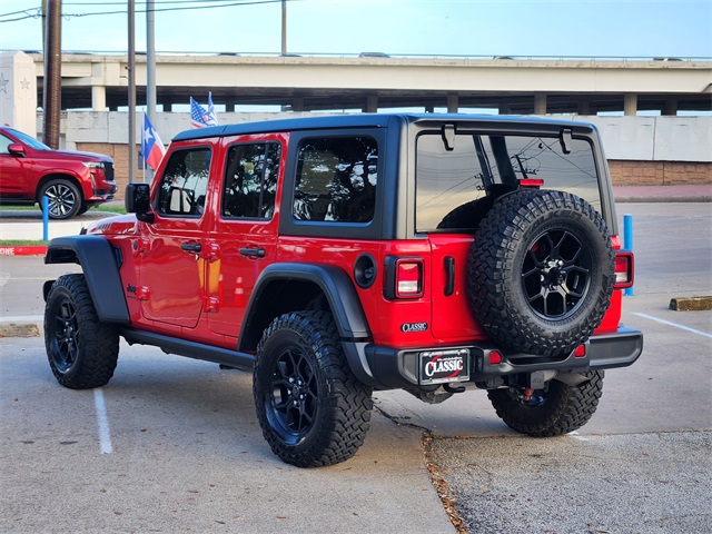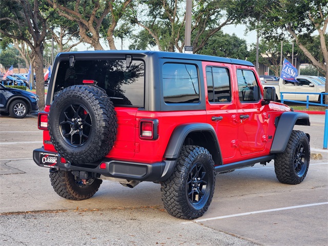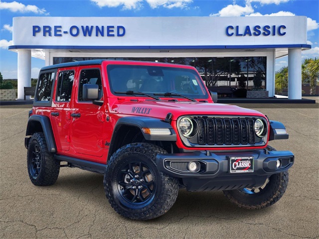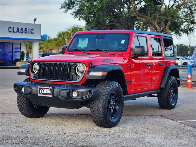 CARFAX One-Owner. Firecracker Red Clearcoat 2024 Jeep Wrangler Willys 4WD 6-Speed Manual 3.6L V6 24V VVT LOCAL TRADE, CARFAX MINOR DAMAGE, CARFAX 1 OWNER, 4WD, NAVIGATION, KEYLESS ENTRY, REMOTE START, SIRIUS XM RADIO, AM/FM/HD RADIO, BLUETOOTH HANDS FREE CALLING, FRONT USB CHARGING PORTS, MP3 IPOD COMPATIBLE, AUTO HEADLIGHTS, DAYTIME RUNNING LIGHTS, LANE DEPARTURE WARNING SYSTEM, RUNNING BOARDS, TOW PKG, 240 Amp Alternator, 4-Wheel Drive Swing Gate Decal, 4.10 Rear Axle Ratio, 7 & 4 Pin Wiring H
