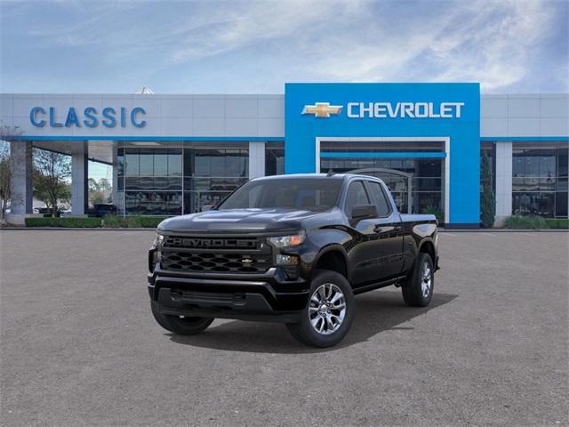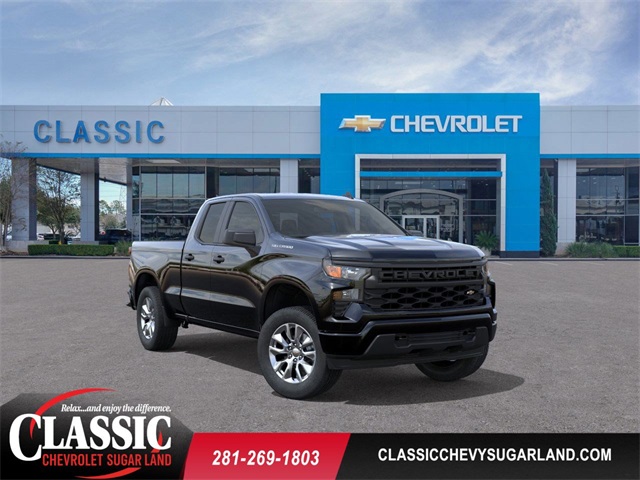 Black 2026 Chevrolet Silverado 1500 Custom RWD 8-Speed Automatic 2.7L I4 Turbocharged DOHC 16V LEV3-SULEV30 310hp 8-Speed Automatic, Jet Black Cloth.