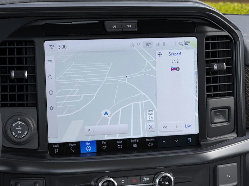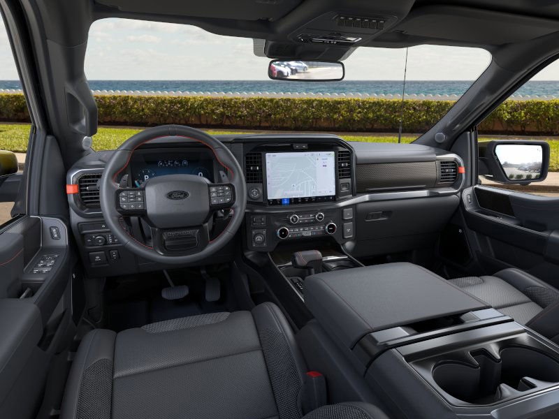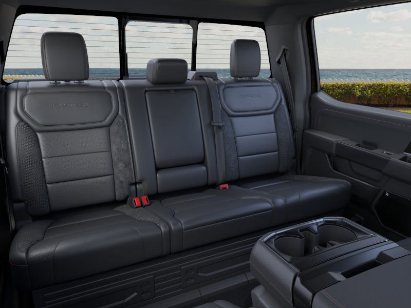 Brake assist, Bumpers: body-color, Compass, Delay-off headlights, Driver door bin, Driver vanity mirror, Dual front impact airbags, Dual front side impact airbags, Electronic Locking w/4.10 Axle Ratio, Electronic Stability Control, Emergency communication system: SYNC 4 911 Assist, Front anti-roll bar, Front Bucket Seats, Front Center Armrest, Front dual zone A/C, Front fog lights, Front reading lights, Front wheel independent suspension, Fully automatic headlights, Garage door transmitter, Heads-Up Display, Heated door mirrors, Heated Front Seats, Heated rear seats, Heated steering wheel, Illuminated entry, Lane Departure Warning System, Leather steering wheel, Leather Trimmed Seats, Low tire pressure warning, Memory seat, Navigation system: Connected Navigation, Occupant sensing airbag, Outside temperature display, Overhead airbag, Overhead console, Panic alarm, Passenger door bin, Passenger vanity mirror, Pedal memory, Power door mirrors, Power driver seat, Power passenger seat, Power steering, Power windows, Radio data system, Radio: B&O Unleashed Sound System by Bang & Olufsen, Rain sensing wipers, Rear reading lights, Rear step bumper, Rear window defroster, Remote keyless entry, Security system, Speed control, Speed-sensing steering, Split folding rear seat, Steering wheel memory, Steering wheel mounted audio controls, SYNC 4 w/Enhanced Voice Recognition, Tachometer, Telescoping steering wheel, Tilt steering wheel, Tough Bed Spray-In Bedliner, Traction control, Trip computer, Turn signal indicator mirrors, Twin Panel Moonroof, Variably intermittent wipers, and Ventilated front seats.