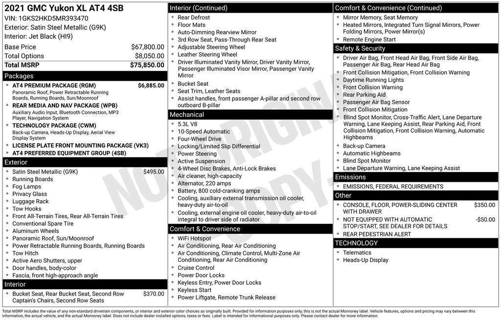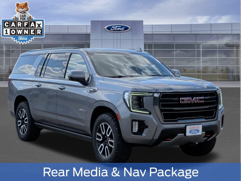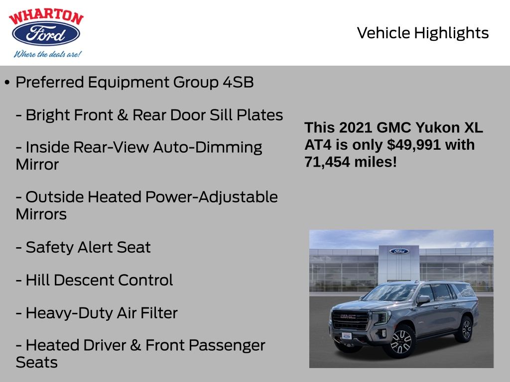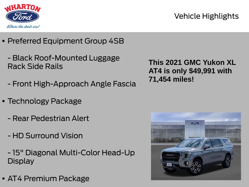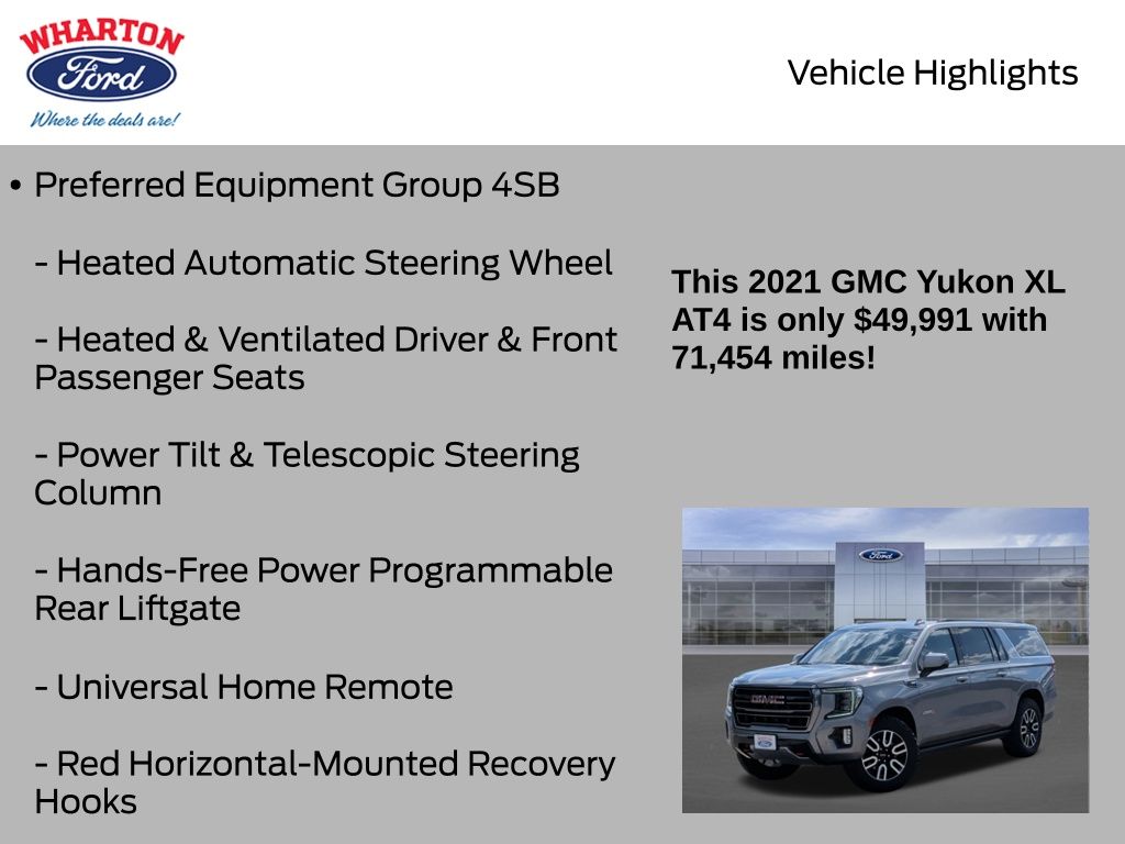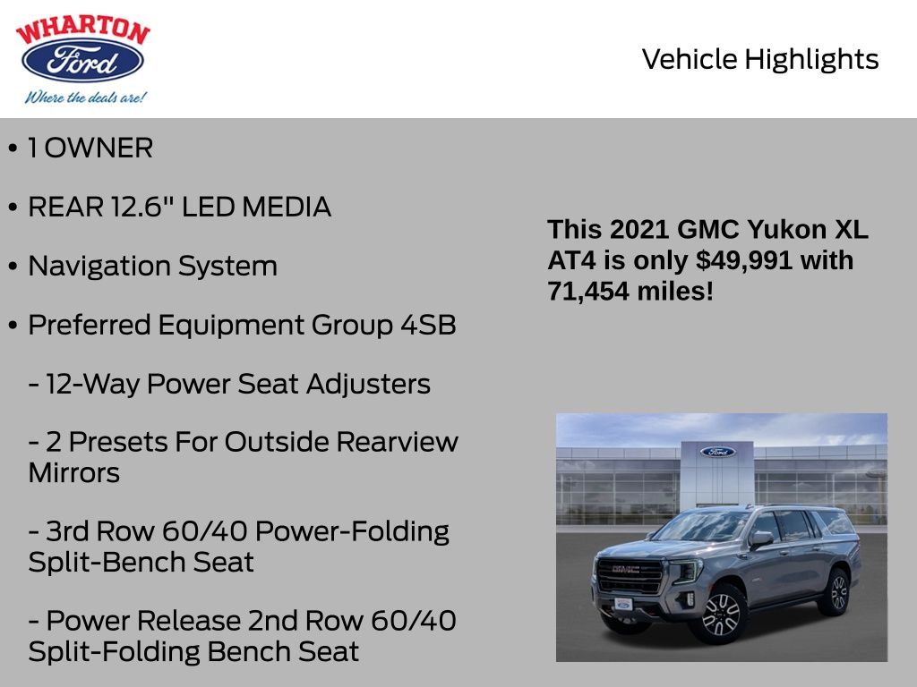 Satin Steel Metallic 2021 GMC Yukon XL AT4 4WD 10-Speed Automatic with Overdrive EcoTec3 5.3L V8 1 OWNER, REAR 12.6" LED MEDIA, 4WD, 12-Way Power Seat Adjusters, 15" Diagonal Multi-Color Head-Up Display, 2 Presets For Outside Rearview Mirrors, 3rd Row 60/40 Power-Folding Split-Bench Seat, Adaptive suspension, Alloy wheels, AT4 Premium Package, Black Roof-Mounted Luggage Rack Side Rails, Bose 9-Speaker Stereo Audio System Feature, Bright Front & Rear Door Sill Plates, Dual-Pane Panoramic Power Su