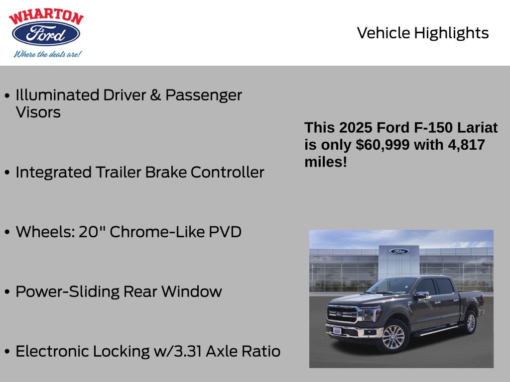 Certified. Marsh Gray 2025 Ford F-150 Lariat 4WD 10-Speed Automatic 5.0L V8 1 OWNER, 4WD, 4x4 FX4 Off-Road Bodyside Decal, 6" Angular Bright Anodized Step Bar, Electronic Locking w/3.31 Axle Ratio, Equipment Group 501A Mid, FX4 Off-Road Package, Hill Descent Control, Illuminated Driver & Passenger Visors, Integrated Trailer Brake Controller, Monotube Rear Shocks, Off-Road Tuned Front Shock Absorbers, Power-Sliding Rear Window, Rock Crawl Mode, Tow/Haul Package, Tray Style Floor Liner w/o Carpet